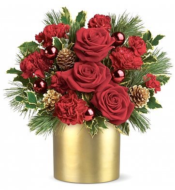 GiftTree , Add a little pizzaz to Christmas this year with this stylish arrangement that features rich red flowers in a golden vase. The bouquet includes fresh flowers such as red roses, carnations, and miniature carnations, as well as holiday accents such as holly, golden pinecones, and more. Perfectly color-coordinated and arranged, the bouquet is a beautiful way to send your best wishes this holiday season. Approximately 13" W x 14" H. To ensure the best arrangement, flower varieties and container may vary.